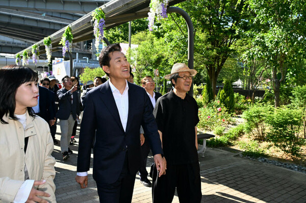 오세훈 서울시장이 박람회에 참석한 시민들과 함께 사진 촬영을 하고 있다.